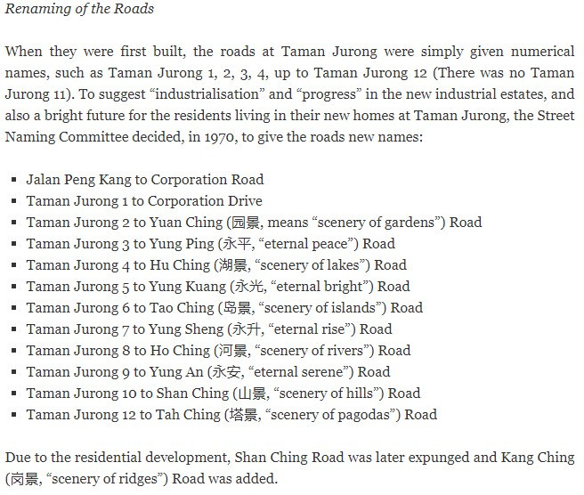 It is an uphill task to accurately reflect a multiracial and multilingual landscape of a country. The Jurong (either Jerung: shark or Jurang: gorge, or Penjuru: corner) Town Corporation (JTC) faced such a challenge when they were developing their namesake area. They wanted a good mix of names, but because many investors were Chinese, Chinese road names ended up taking a larger share of the pie. There still were Malay road names, like Jalan Tukang (skilled craftsman) and Tamil ones, like Neythal Road ('to weave' [textiles]).